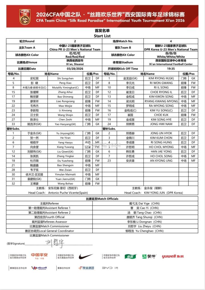 北京时间3月28日19:35,中国之队邀请赛西安赛第2轮,U23国足对阵朝鲜U23。赛前首发公布。