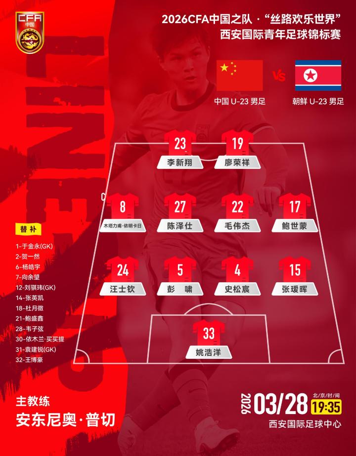 U23国足vs朝鲜U23:李新翔、毛伟杰首发,向余望、王博豪替补