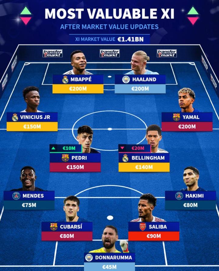 扫描下载懂球帝首页>动态> 德转更新最贵11人阵容:皇马3人入选,总身价14.1亿欧元