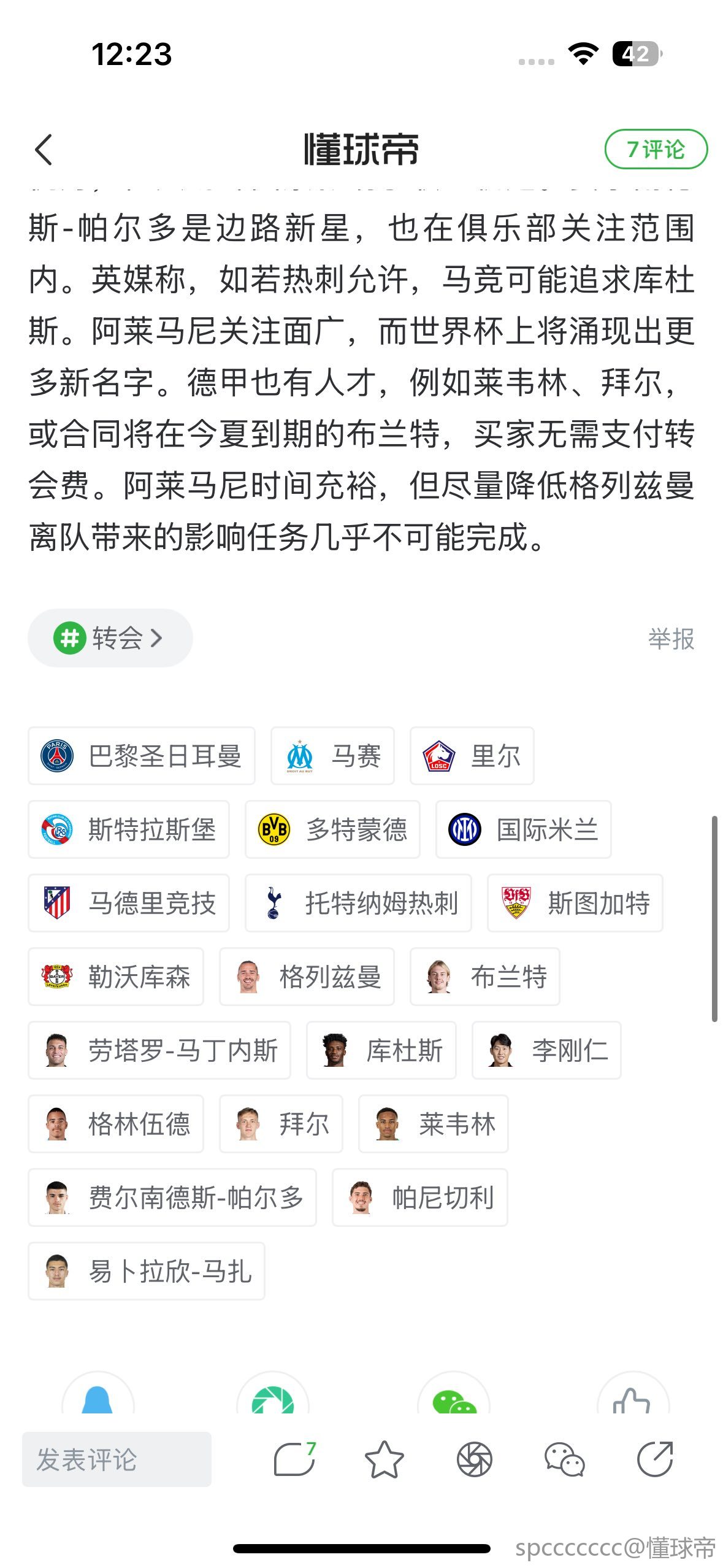 格列兹曼离队对马竞来说最大的损失是进攻组织能力和创造力。马扎在勒沃库森表现出色,马竞一直关注他的成长。李刚仁在阿莱马尼的引援名单上,冬季转会窗曾尝试引进,他左脚技术出色、射门精准,但从巴黎圣日耳曼带走难度较大。格林伍德在马赛打入16球,曾在赫塔菲表现优秀,但其场外因素影响了职业轨迹。费尔南德斯-帕尔多是边路新星,也在俱乐部关注范围内。英媒称,如若热刺允许,马竞可能追求库杜斯。阿莱马尼关注面广,而世界杯上将涌现出更多新名字。德甲也有人才,例如莱韦林、拜尔,或合同将在今夏到期的布兰特,买家无需支付转会费。阿莱马尼时间充裕,但尽量降低格列兹曼离队带来的影响任务几乎不可能完成。