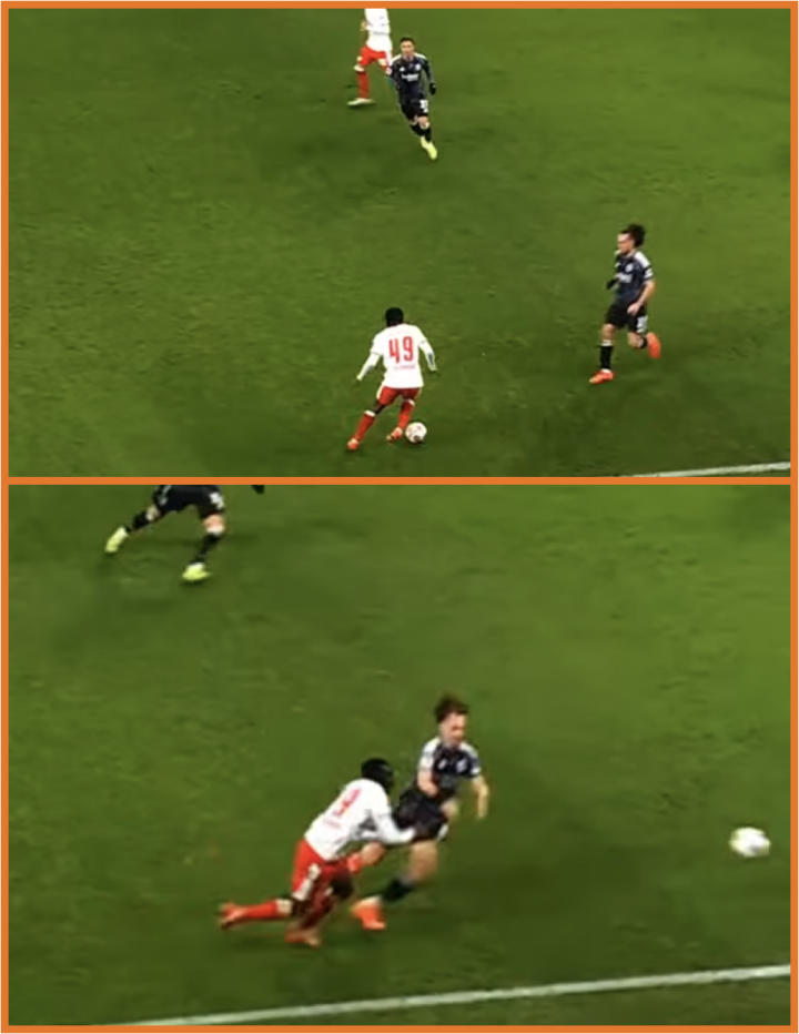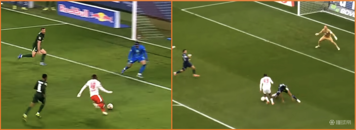 当然,这也是受限于RB Leipzig的踢法,更多是走地面层层推进,使得纵深不太有大步流星的空间(当然,即便有大步流星的空间,我看到的迪奥曼德在高速的人球结合上还是不可避免因为想更稳妥地控球,而选择降速)