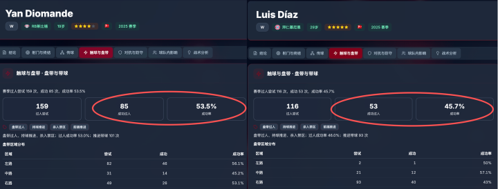 无论是盘带尝试、成功、还是成功率,迪奥曼德都更高,这是因为他身体的灵活性、柔韧性,走变向的带球方式刷出来的。