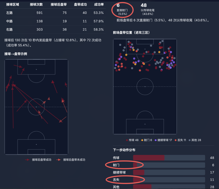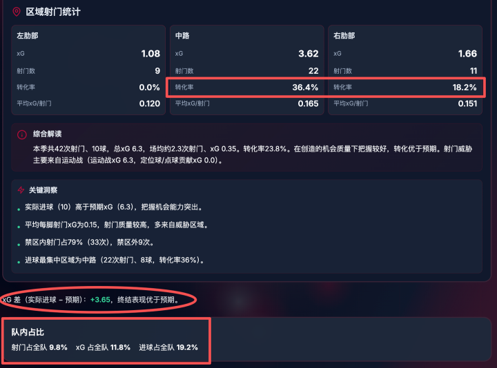 而在进球区域里,来自中路和右肋部的射门转化率奇高。