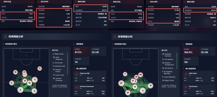 左边是利物浦,右边是莱比锡,二者在结构设计思路上是有相似的,但是问题就在于,利物浦现在的OPPDA(控球状态下对方平均每次防守,本方的传球次数,这个越高越好)出问题了(即控不住球,拿住球了之后容易丢球权),以及在进攻序列时间里太慢。