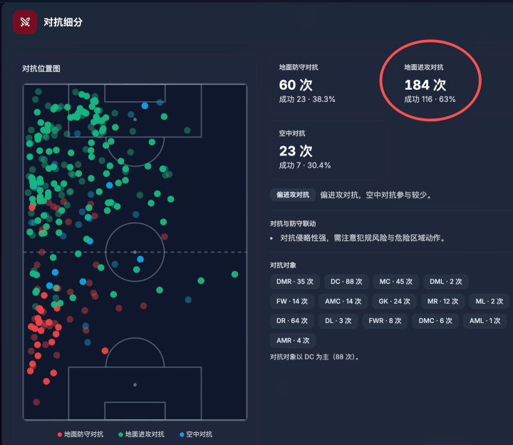 他的进攻地面对抗成功率高达63%,这在德甲是相当超标的。