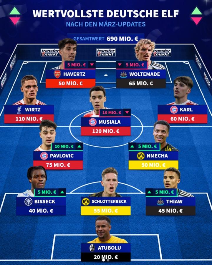 扫描下载懂球帝首页>动态> 德转列德国最贵11人阵容:穆西亚拉、维尔茨领衔,哈弗茨在列