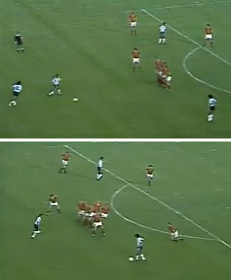 但是,这张照片是有误导性的。从画面上看,似乎马拉多纳正在被严密盯防。实际上,当时的场景是:马拉多纳在禁区右侧接到了队友的短距离任意球传球。随后比利时队排出的人墙散开,转过身来准备向他靠近。在这次进攻中,马拉多纳的传中球也被比利时队解围了出来。