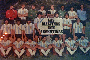 阿根廷队举起有关马岛的标语
