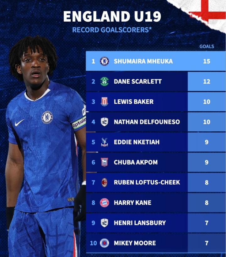 扫描下载懂球帝首页>动态> 德转列英格兰U19代表队历史射手榜:切尔西小将姆厄卡15球第1