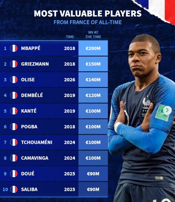 扫描下载懂球帝首页>动态> 德转法国球员历史身价榜:姆巴佩2亿第1,格子第2,奥利塞第3