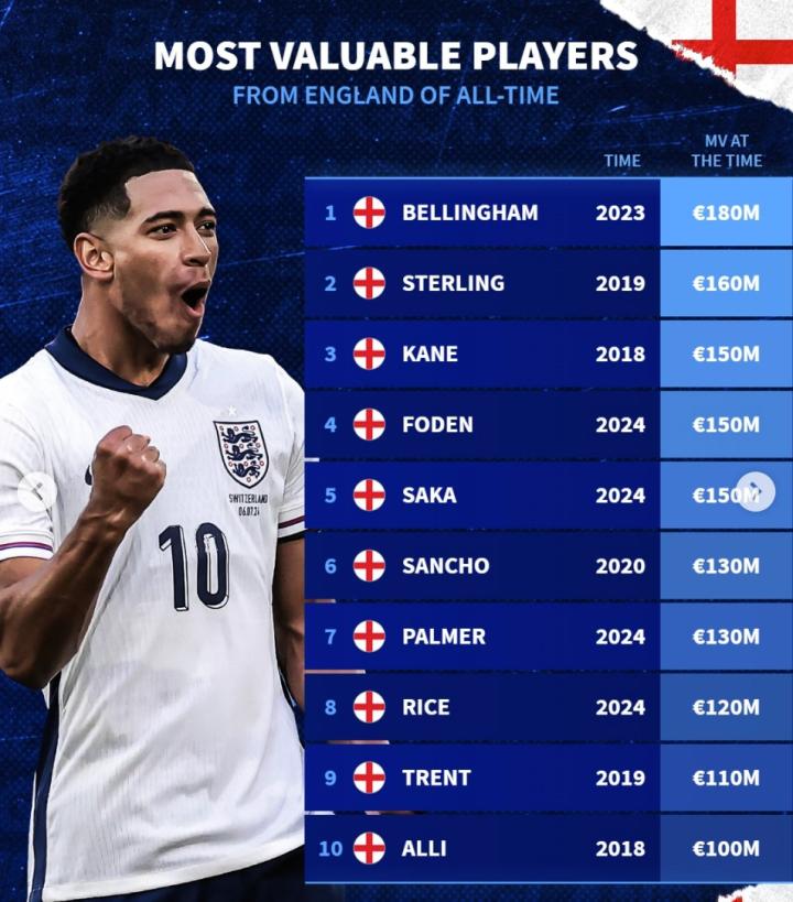 扫描下载懂球帝首页>动态> 德转英格兰球员历史身价榜:贝林1.8亿欧第1,斯特林1.6亿第2
