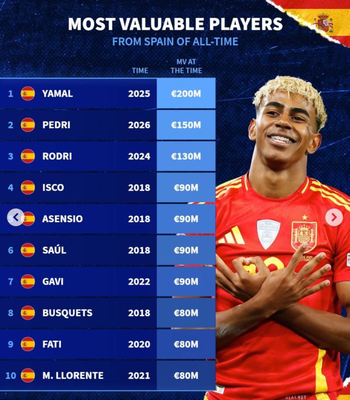 扫描下载懂球帝首页>动态> 西班牙球员历史身价榜:亚马尔2亿欧第1,佩德里第2,法蒂上榜