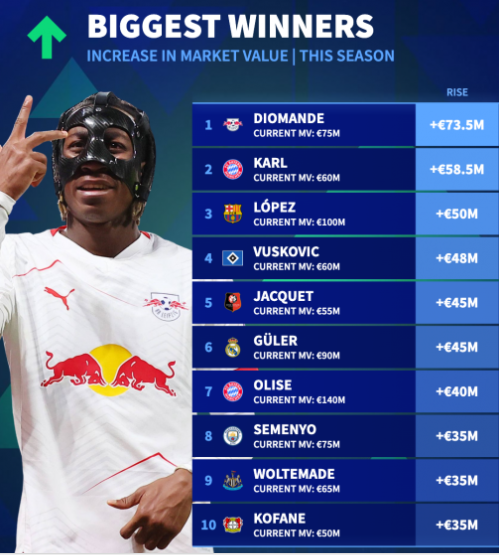 本赛季德转身价涨幅榜:扬-迪奥曼德暴涨7350万欧第1,卡尔第2