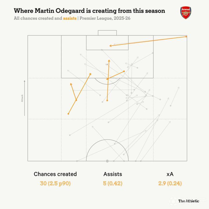 尽管厄德高只踢了联赛总出场时间的38.6%,他仍是阿森纳进攻端贡献最突出的球员之一。