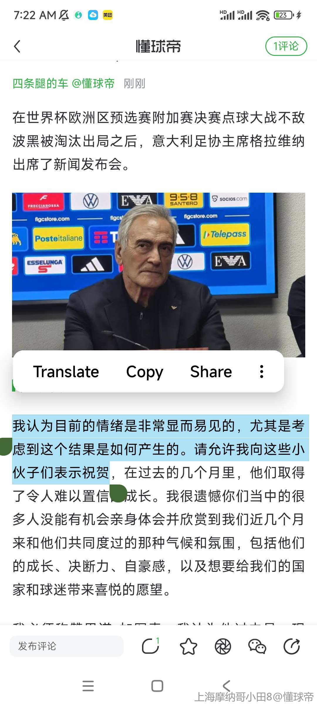 我们知道自己正处于一个严重的危机时刻,这是一个普遍的危机,需要全面的反思。但是这不仅是足协的责任,也是意大利政治界的责任。我看到政治界立即表现得很积极,加速要求辞职,但我更想请求至少出台一项有用的措施,一项我们曾请求过的、能够支持意大利足球运动增长的措施,这是一个我们在政治层面必须面对的问题。