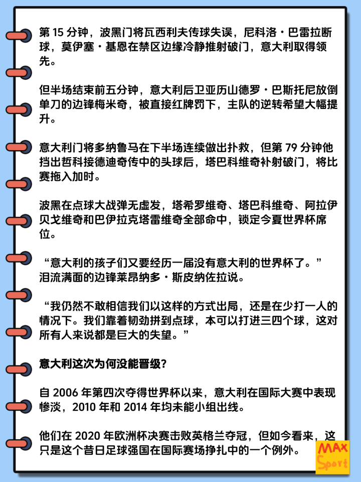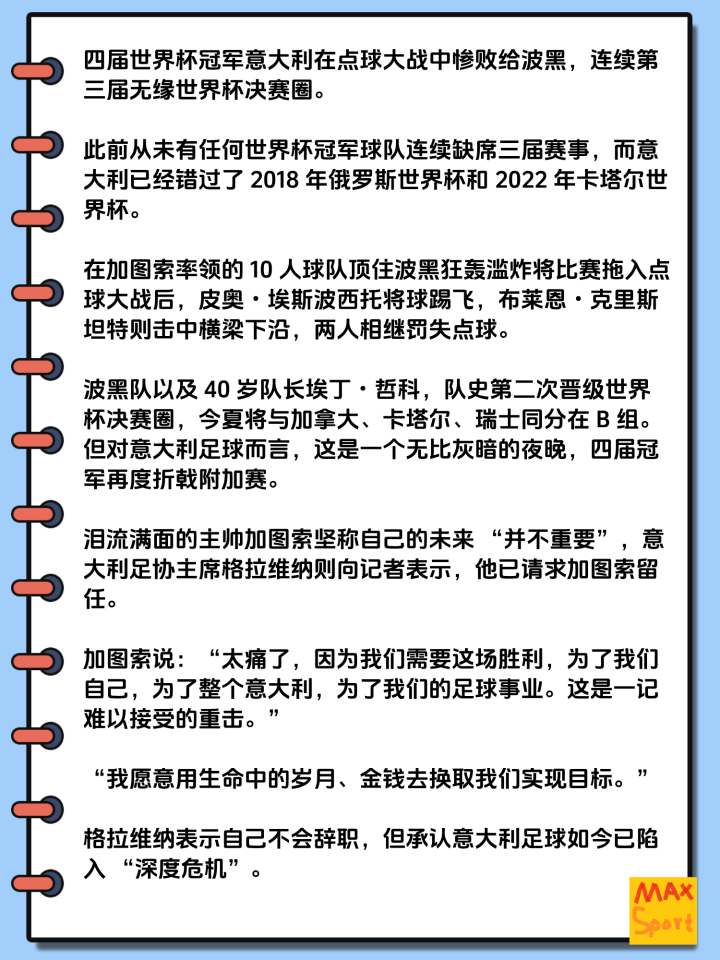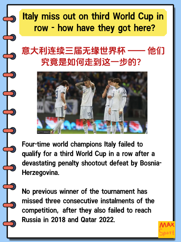 04-01 10:30意大利连续三届无缘世界杯!《米兰体育报》直言:全员回家