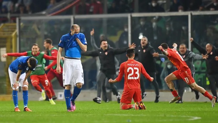 预选赛附加赛C组半决赛,意大利对阵北马其顿。上半场比赛贝拉尔迪错失良机,球队破门乏术,下半场伤停补时第2分钟,特拉伊科夫斯基打进制胜球,最终北马其顿在客场1-0淘汰意大利,蓝衣军团再次倒在附加赛。其实即使这场比赛获胜,他们还要在附加赛决赛中面对葡萄牙,对于状况不理想的意大利来说,仍然有不小的可能最终无缘世界杯。