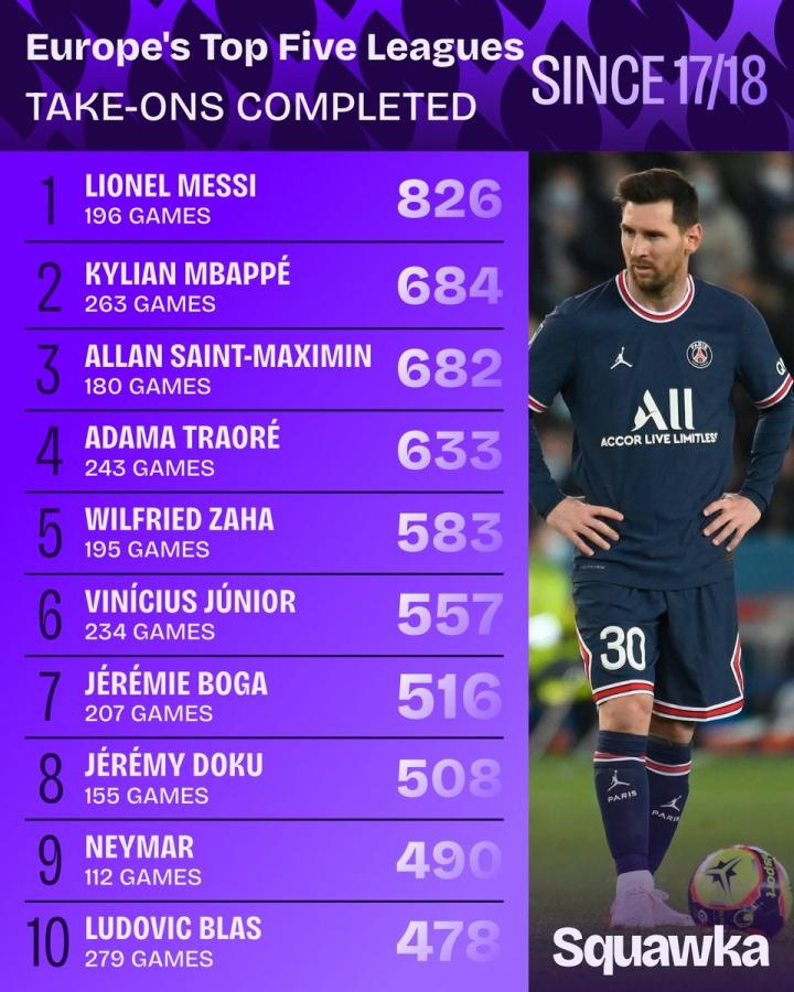 扫描下载懂球帝首页>动态> 17/18赛季至今五大联赛成功过人榜:梅西断层领先,姆巴佩第二