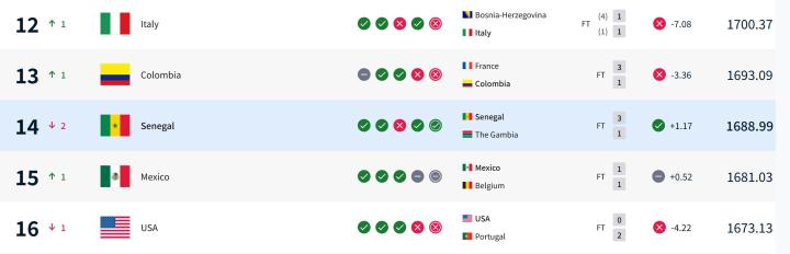 扫描下载懂球帝首页>动态> 塞内加尔因冠军剥夺减少21.98分,意大利不敌波黑世界排名反上升