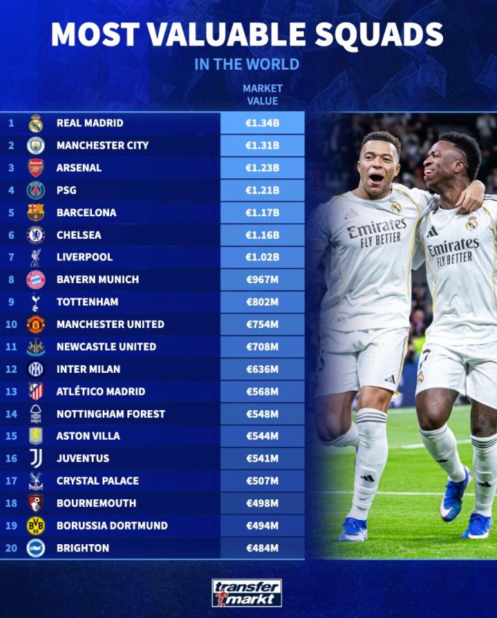 扫描下载懂球帝首页>动态> 世界俱乐部身价前20:皇马13.4亿欧第1,曼城第2,阿森纳第3
