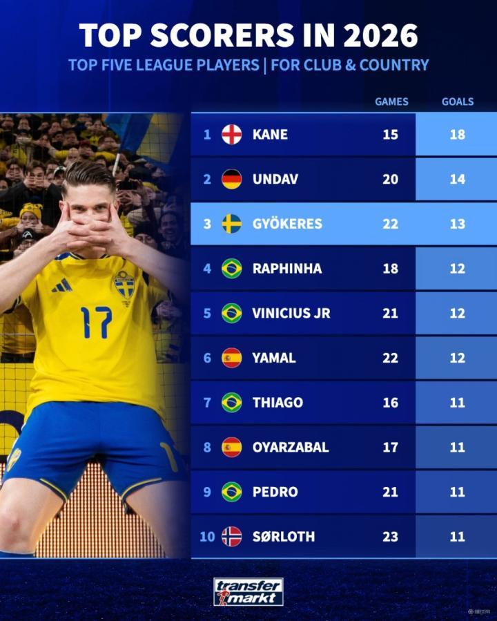 扫描下载懂球帝首页>动态> 五大联赛球员2026年国家队+俱乐部进球榜:凯恩第1,哲凯第3