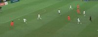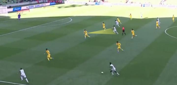 张玉宁不仅在空中完全占据优势,在地面拿球时库拉索的后卫也是对他毫无办法。这次张玉宁接到队友的界外球,禁区线左侧背身拿球,转身扛开后卫冲入禁区,变向晃开角度之后倒三角传中,可惜没有队友跟进,错失了一次非常不错的进攻机会。