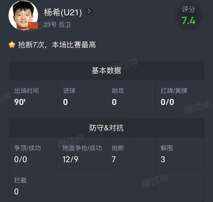 对阵库拉索的比赛,刘浩帆、杨希、徐彬、王钰栋4名此前随队参加U23亚洲杯的U23国脚代表国足首发出场,他们4人也作为首发球员参加U23亚洲杯决赛,其中杨希和徐彬也完成了他们在成年国家队的首秀。本场比赛杨希作为首发右后卫打满90分钟,完成全队最高的7次抢断、12次地面对抗成功9次以及3次解围的亮眼数据。库拉索作为归化大队,在进攻端相当依赖球员的个人发挥,杨希本场比赛完全遏制住了库拉索的左路进攻。用杨希自己的话来说:“在中超都防的是外援,早就熟悉了这种强度。”