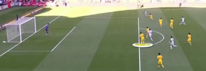 作为三中卫靠右的吾米提江在第一个丢球中暴露了他转身慢的弱点,喀麦隆前锋永乔在离吾米提江还有2-3个身位时向禁区加速冲刺,最后竟然将吾米提江压制在了自己的身后,此外刘浩帆也没有第一时间启动跟上他,埃永正是利用永乔创造出来的空间攻破了国足的球门。