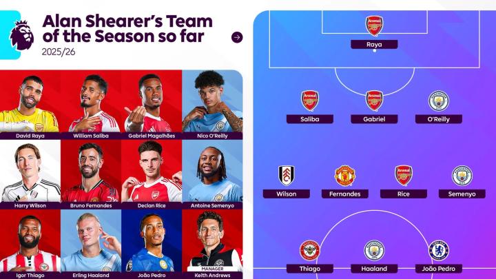扫描下载懂球帝首页>动态> 希勒评英超赛季至今最佳阵容:阿森纳4人,曼城3人,B费入选