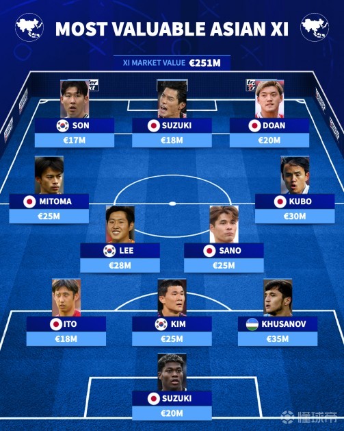 右中场是久保建英(3000万欧元),左中场是三笘薰(2500万欧元),两人均来自日本队。韩国传奇球星孙兴慜(1700万欧元)与日本球星铃木唯人(1800万欧元)、堂安律(2000万欧元)组成前场三人组。日本是这套阵容中最具统治力的国家,共有七名球员入选,整套阵容的总身价为2.51亿欧元。