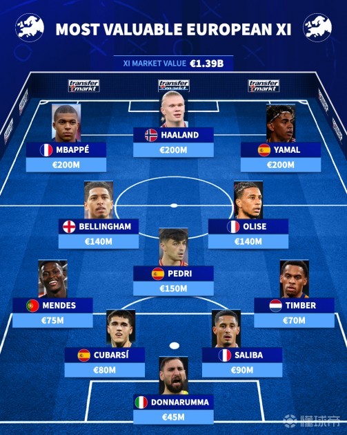 在这位西班牙人身前,是英格兰的贝林厄姆(1.4亿欧元)和法国的奥利塞(1.4亿欧元)。右边锋位置由亚马尔(2亿欧元)占据,左边锋则是法国的姆巴佩(2亿欧元),中锋位置由挪威的哈兰德(2亿欧元)担任。这套阵容中,西班牙和法国是最具统治力的两个国家,均有三名球员入选,阵容总身价高达惊人的13.9亿欧元。