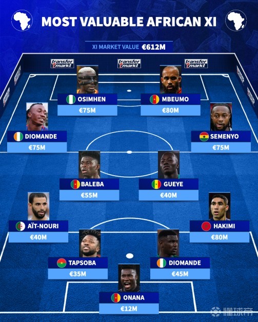 右边锋是加纳人塞门约(7500万欧元),左边锋则是近期身价暴涨3000多万欧元的17岁科特迪瓦小将扬-迪奥曼德。锋线上,尼日利亚人奥斯梅恩(7500万欧元)——他将无缘本届世界杯——与喀麦隆人姆伯莫(8000万欧元)搭档。喀麦隆是这套阵容中最具统治力的国家,有三名球员入选,整套阵容的总身价为6.12亿欧元。