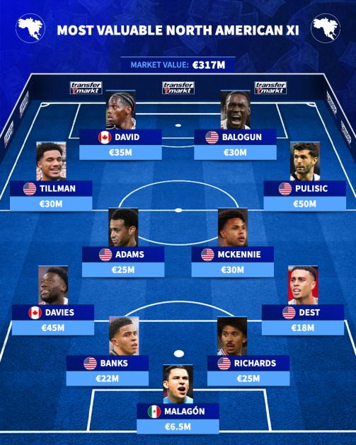 美国队在边路的统治力得以延续,蒂尔曼(3000万欧元)司职左路,普利希奇(5000万欧元)——阵容中身价最高的球员——出现在右路。锋线则由加拿大人乔纳森-戴维(3500万欧元)和美国人福拉林-巴洛贡(3000万欧元)搭档。这套阵容中共有七名球员来自美国,总身价为3.17亿欧元。
