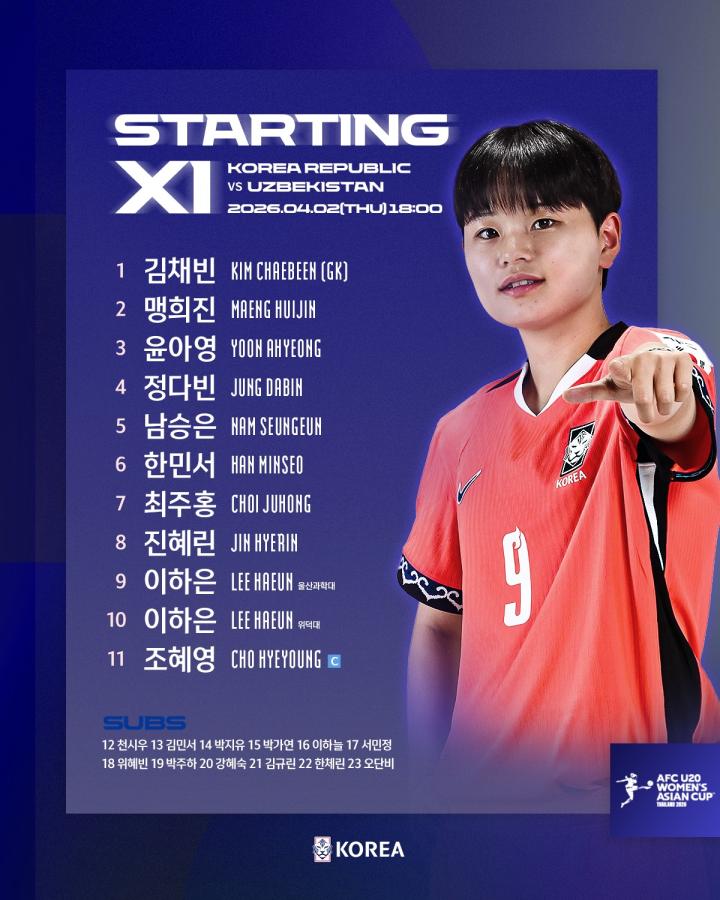 附:韩国U20女足首战对乌兹别克斯坦名单