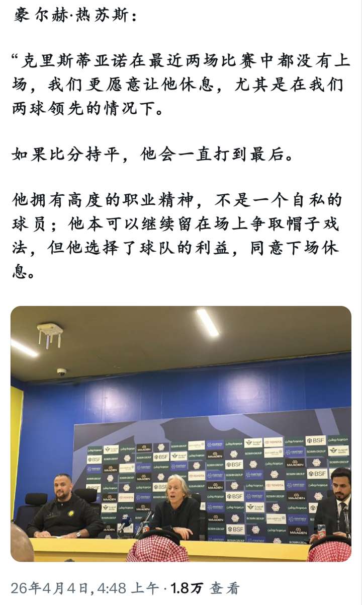 利雅得胜利主帅:C罗考虑到球队利益,没有冒受伤风险戴帽