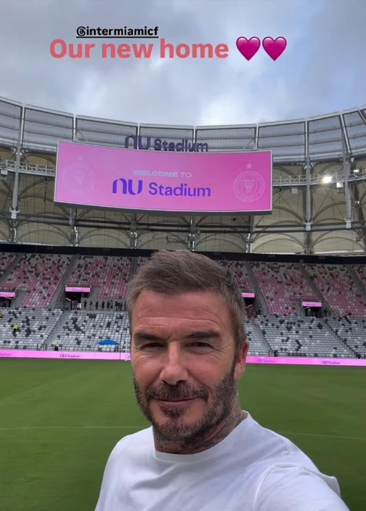 贝克汉姆在社媒发布了球队在Nu体育场首次训练的照片,并为这段展现崭新粉白配色球场的视频配文:“我们的新家”,附带两颗粉色爱心表情。