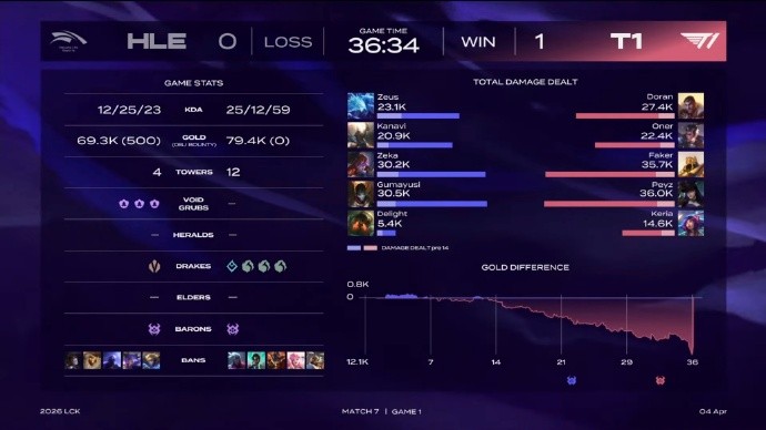 北京时间4月4日,LCK第一赛段,HLE对阵T1,最终T1连胜两局,2-0战胜HLE。