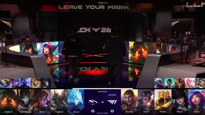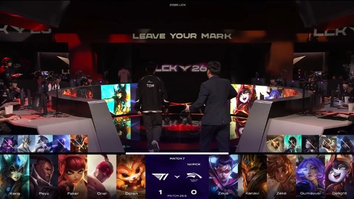 本局HLE选出上单冰鸟的奇招,并且打出了一波将Oner卡在塔下的操作。第二条小龙的争夺上,虽然HLE拿下小龙,但是Faker沙皇进场推回两人,天平开始倒向T1。Kanavi随后发狂直接飞T1二塔送出人头,虽然之后他抢到大龙,但HLE还是无力抵抗,T1较为轻松地拿下了第一局。