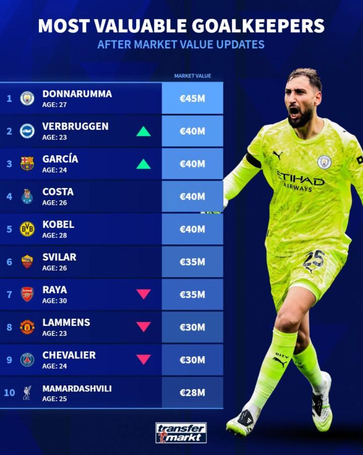 扫描下载懂球帝首页>动态> 德转门将身价前10:多纳鲁马4500万第1,霍安第2,拉门斯上榜