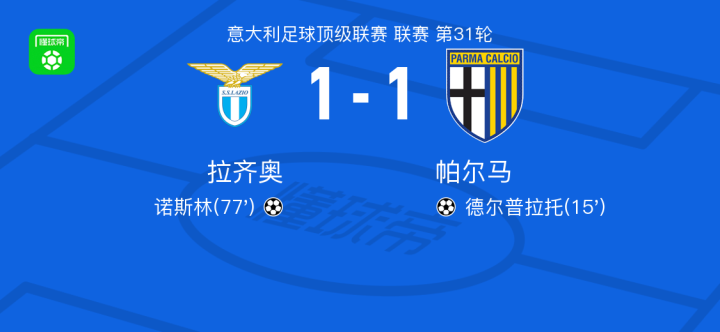 扫描下载懂球帝首页>动态> 拉齐奥1-1帕尔马,德尔普拉托破僵,诺斯林救主