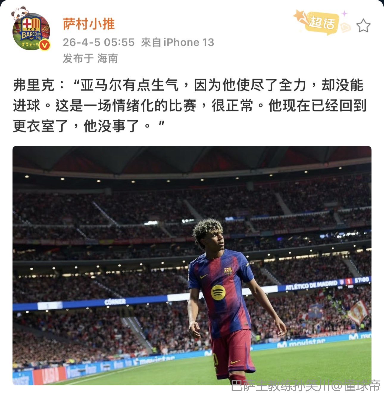 亚马尔就是这样,对自己要求很高;所以,我非常看好下场比赛亚马尔的发挥,正好还是对阵马竞。