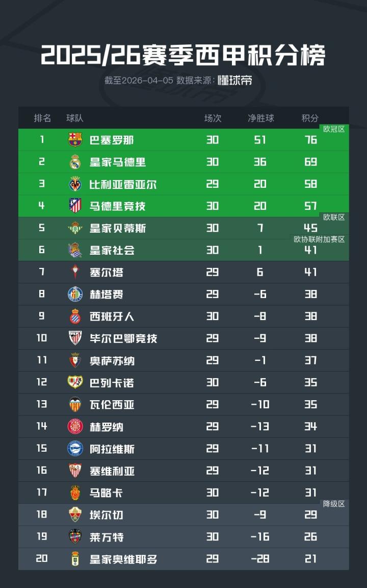 鉴于西甲大概率拿到5个欧冠资格,这赛季欧冠资格线可能只有57-58分左右,欧联资格线在53分左右,欧协可能是52分就行。