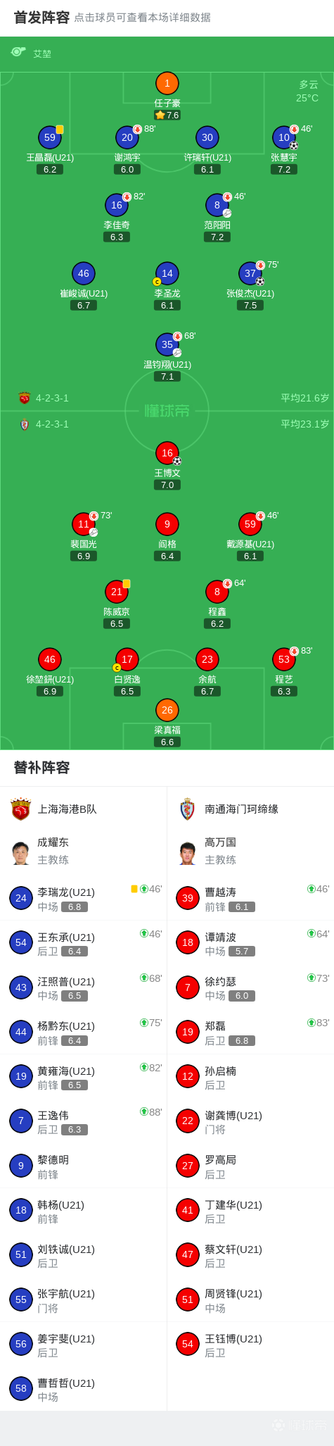 北京时间4月5日中国足球乙级联赛 预赛阶段 第2轮,上海海港B队主场对阵南通海门珂缔缘。上海海港B队张俊杰破门,张慧宇破门。南通海门珂缔缘王博文破门。最终比分上海海港B队 2-1 海门珂缔缘。