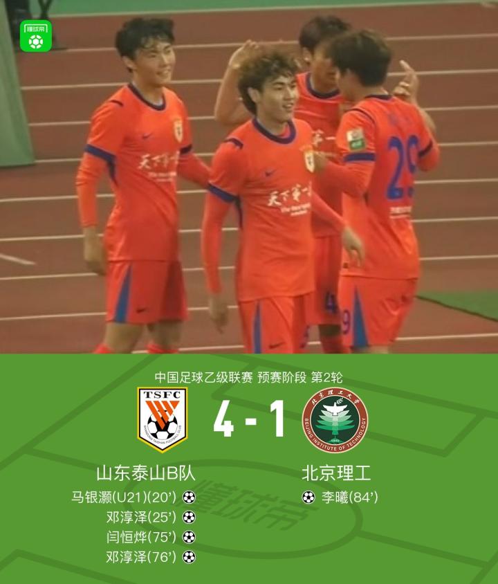 北京时间4月5日中国足球乙级联赛 预赛阶段 第2轮,山东泰山B队主场对阵北京理工。山东泰山B队马银灏破门,邓淳泽梅开二度,闫恒烨破门。北京理工李曦破门。最终比分山东泰山B队 4-1 北京理工。