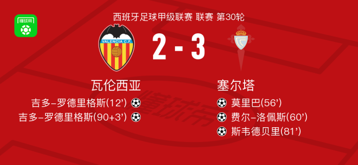 北京时间4月5日西班牙足球甲级联赛 联赛 第30轮,瓦伦西亚主场对阵塞尔塔。瓦伦西亚吉多-罗德里格斯梅开二度。塞尔塔莫里巴破门,费尔-洛佩斯破门,斯韦德贝里破门。最终比分瓦伦西亚 2-3 塞尔塔。