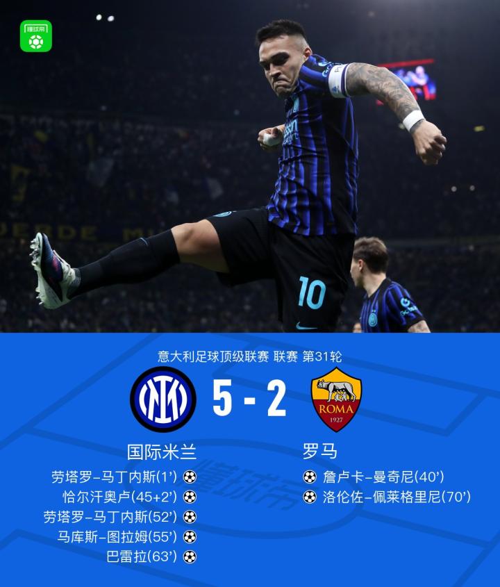 扫描下载懂球帝首页>动态> 剑南春|国米5-2罗马,劳塔罗双响,恰20世界波,图拉姆造3球