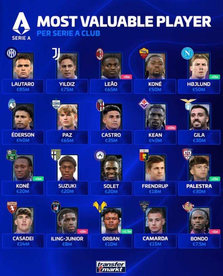扫描下载懂球帝首页>动态> 德转列意甲各队身价最高球员:劳塔罗8500万最高,霍伊伦上榜