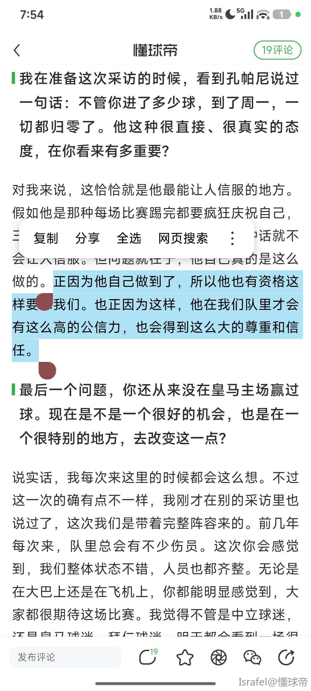 说实话,我每次来这里的时候都会这么想。不过这一次的确有点不一样,我刚才在别的采访里也说过了,这次我们是带着完整阵容来的。前几年每次来,队里总会有不少伤员。这次你会感觉到,我们整体状态不错,人员也都齐整。无论是在大巴上还是在飞机上,你都能明显感觉到,大家都很期待这场比赛。我觉得不管是中立球迷,还是皇马球迷、拜仁球迷,明天都会看到一场很精彩的比赛。