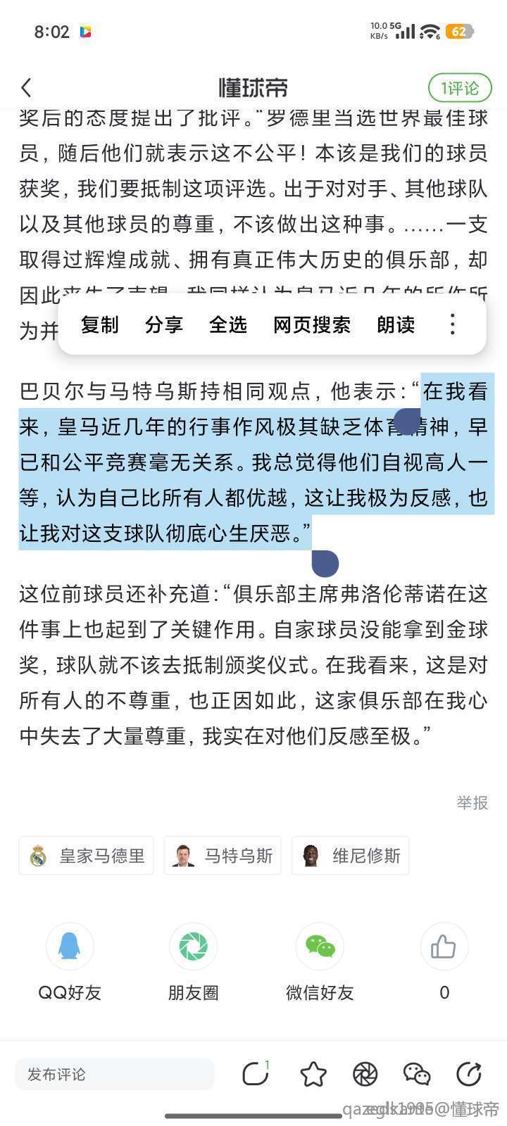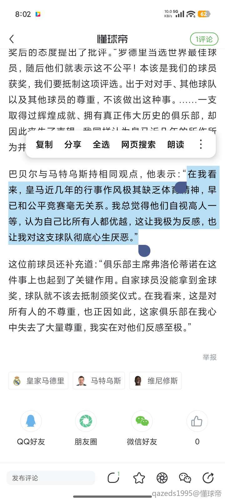 这句话说的一点毛病也没有。就是现在一些皇马球迷的状态。很了不起一样。