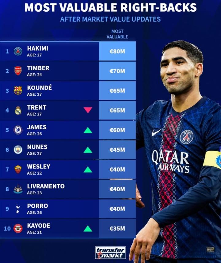 德转列右后卫身价前10:阿什拉夫8000万第1,廷贝尔7000万第2